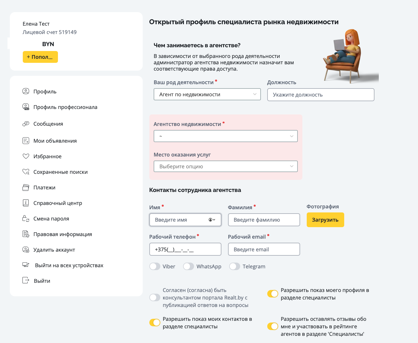 После заполнения информации, интерфейс Вашего аккаунта изменится на личный кабинет профессионального участника рынка - Вам будет предложено заполнить информацию о себе в блоке Профиль профессионала