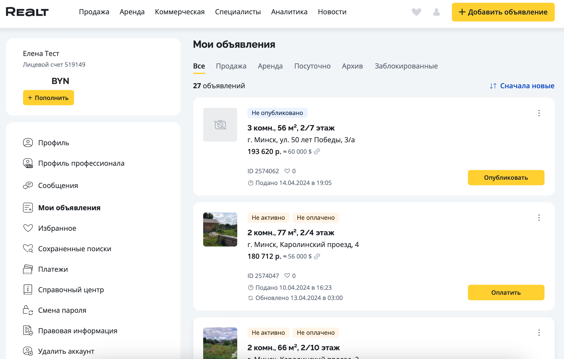 На площадке Realt предусмотрено 2 типа личного кабинета: