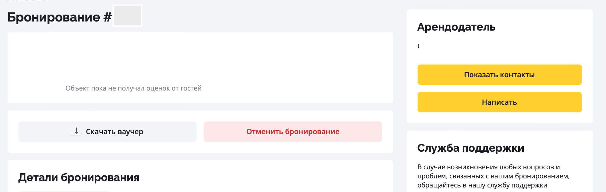 Номер бронирования, контакт арендодателя, возможность написать сообщение, скачать ваучер о предстоящем бронировании.