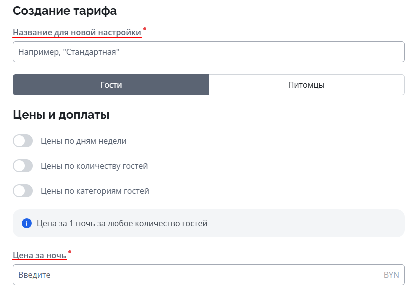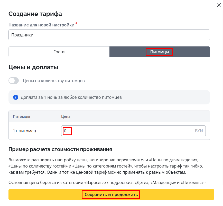 Дополнительно Вы можете указать цену при заезде с питомцем. По умолчанию есть возможность выставить цену за неограниченное количество питомцев, при выставлении ползунка Цена за количество питомцев, Вы сможете выбрать количество питомцев (максимум 5) и выставить цену. Если же проживание с питомцами запрещено или не предусмотрено в поле цены Вы можете выставить 0 BYN.