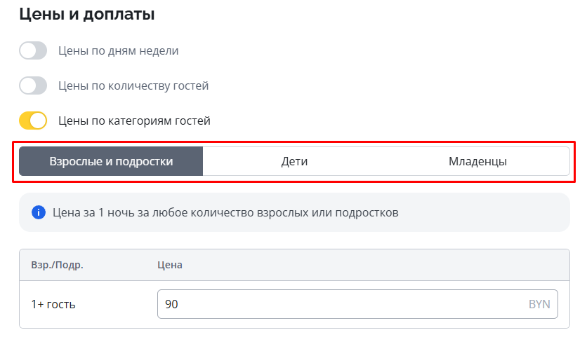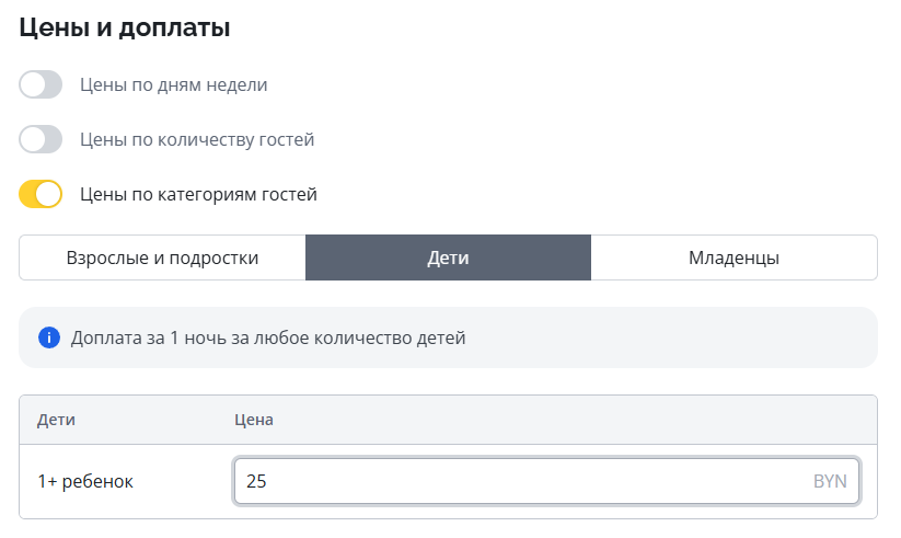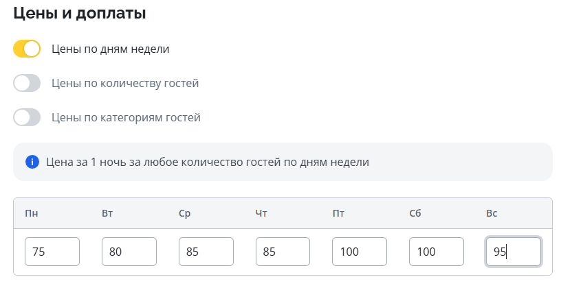 В поле Цены и доплаты требуется определить от чего будет зависеть цена аренды за сутки - Цена по дням недели, Цена по количеству гостей, Цена по категориям гостей, Цена за ночь. Опционально Вы можете выставить несколько ползунков и обозначить цену для всех выбранных критериев.