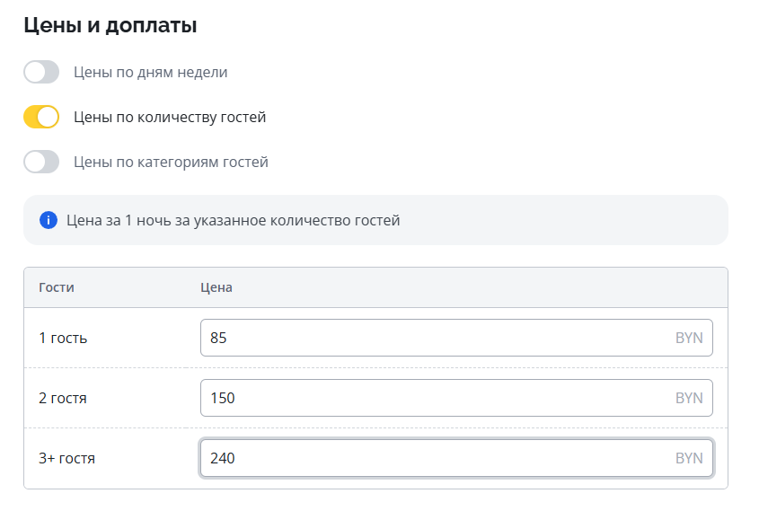 Цена по количеству гостей - позволяет выставить цену за указанное количество гостей, ограничений по количеству гостей нет.