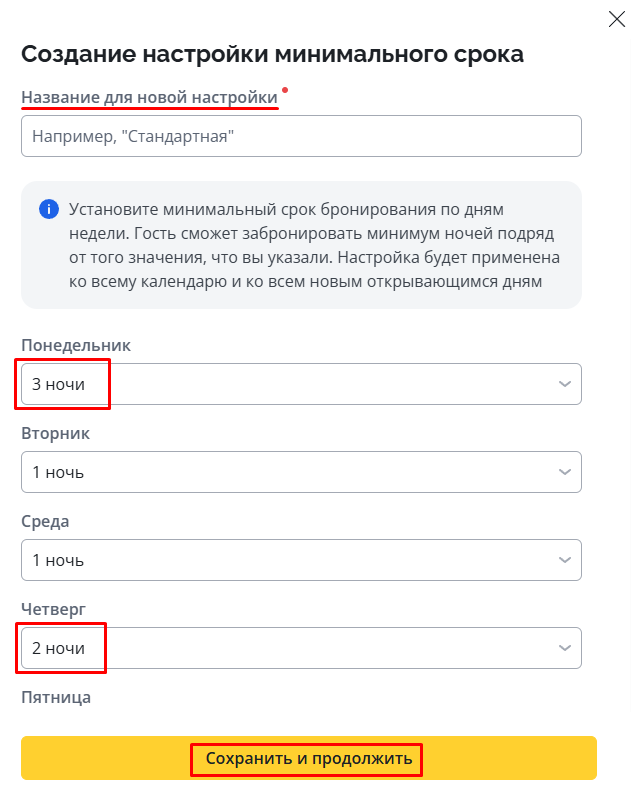 Далее Вы можете создать шаблон Настроек минимального срока - установить минимальный срок бронирования по дням недели. Гость сможет забронировать минимум ночей подряд от того значения, что вы указали. Настройка будет применена ко всему календарю и ко всем новым открывающимся дням. По необходимости Вы всегда можете отредактировать данный шаблон.