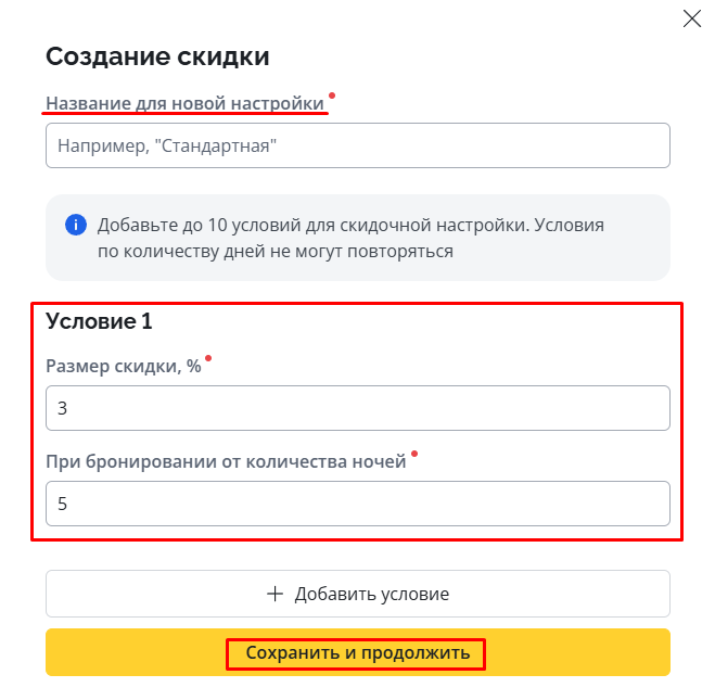 В настройках скидки Вы можете добавить до 10 условий для скидочной настройки. Условия по количеству дней не могут повторяться.