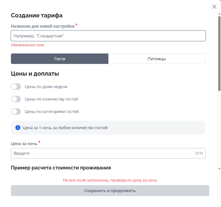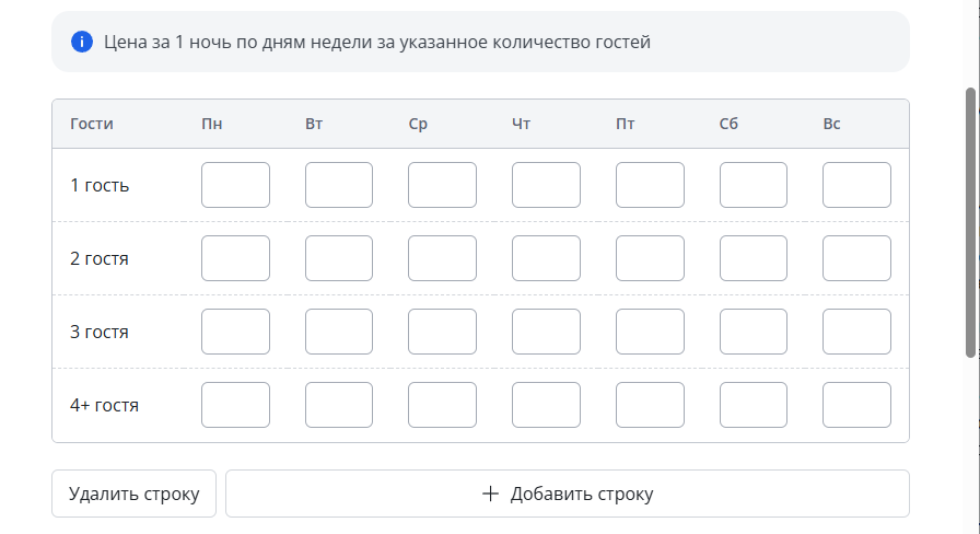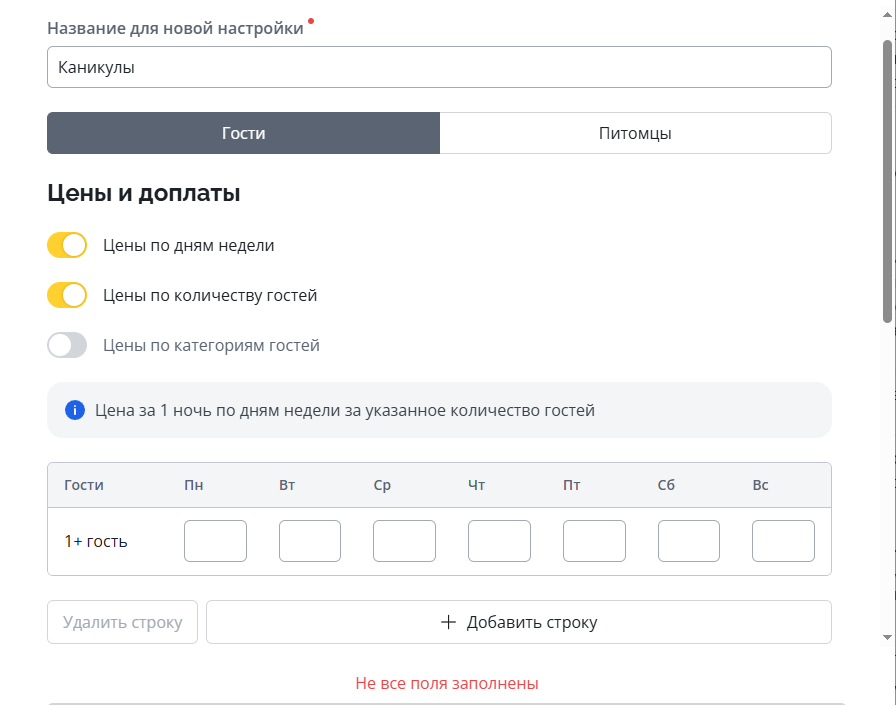 В поле Гости - Цены и доплаты можно выставить ползунок на Цены по дням недели, Цены по количеству гостей и Цены по категориям гостей, выбрать можно как один пункт, так и все 3. Также не выставляя ползунки можно указать только Цену за ночь. В полях можно указать цену на конкретный день недели, в зависимости от заданных параметров.