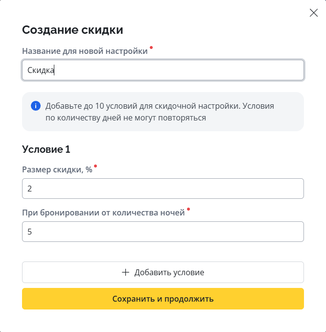 В настройках скидки Вы можете указать размер и условия предоставления скидки.