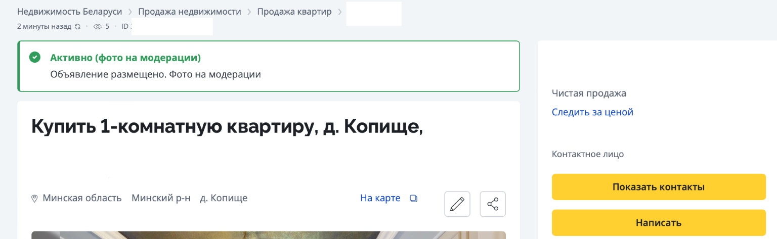 В личном кабинете Вы увидите следующую системную информацию - зеленый статус объявления "активно (фото на модерации)":